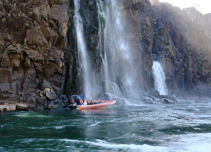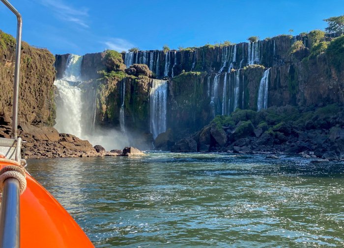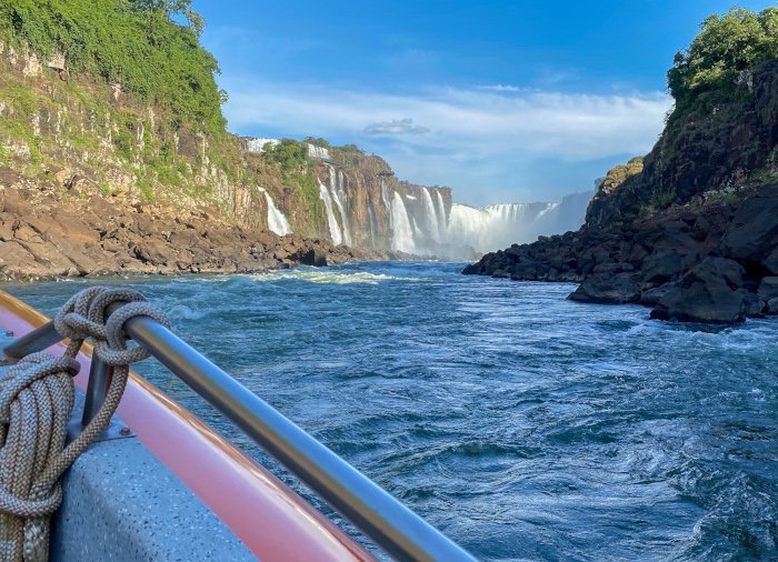 Du får se de gigantiska vattenfallen nerifrån, och som avslutning seglar ni under ett av de mindre vattenfallen så att du kan skryta med att du har tagit en dusch i Iguazúfallen! Det är självklart helt frivilligt om du har lust att ställa dig mitt i vattenkaskaderna. Oavsett vad så blir du garanterat genomblöt på turen, därför är det en bra idé att byta till badkläder eller ta på dig en regnponcho. Du får låna en vattentät väska för dina värdesaker.