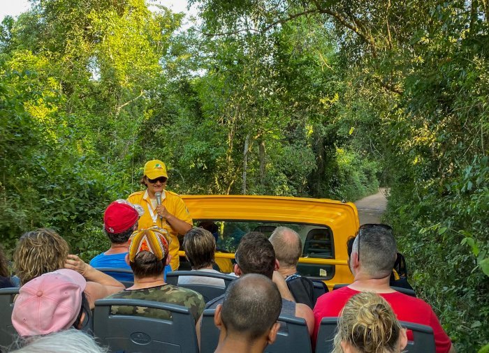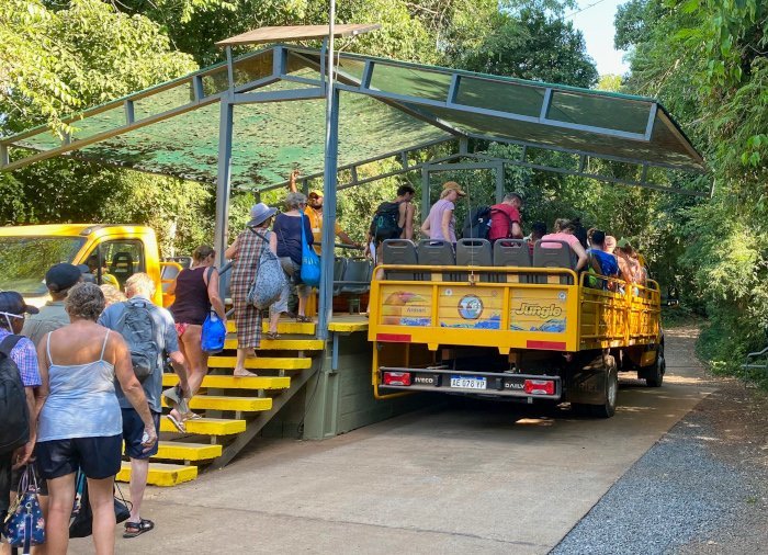Den första delen av turen går med buss genom djungeln längs en 5 kilometer lång grusväg ner till hamnen. Härifrån går en brant trappa ner till hamnen, där en speedbåt väntar på att ta med dig upp längs floden mot de brusande vattenfallen.