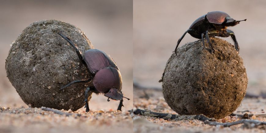 När den stöter på en läcker lort på sin väg omvandlar den lorten till en kula och rullar iväg med den. Som om dyngbaggen inte har tillräckligt att göra med att rulla iväg med den stora lorten så gör den det också med huvudet nedåt och rumpan i vädret. Därför tvingas den ofta ta en paus för att orientera sig och kontrollera att den går i rätt riktning. Det gör den genom att kravla upp på lorten och se på stjärnorna – dyngbaggen är nämligen den första kända insektsarten som använder stjärnorna för att navigera.