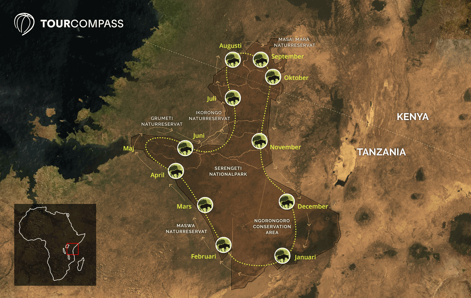 Den stora vandringen är en kontinuerlig process, som upprepas varje år. Det är alltså inte bara en årlig händelse, utan något du kan uppleva året runt på olika platser under djurens vandring.