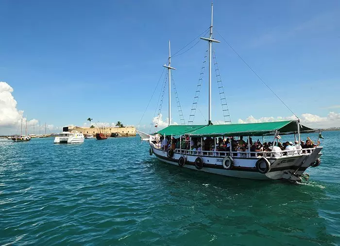 Åk på en härlig båttur i bukten Baía de Todos os Santos och upplev de vackra stränderna runt öarna Frades och Itaparica.