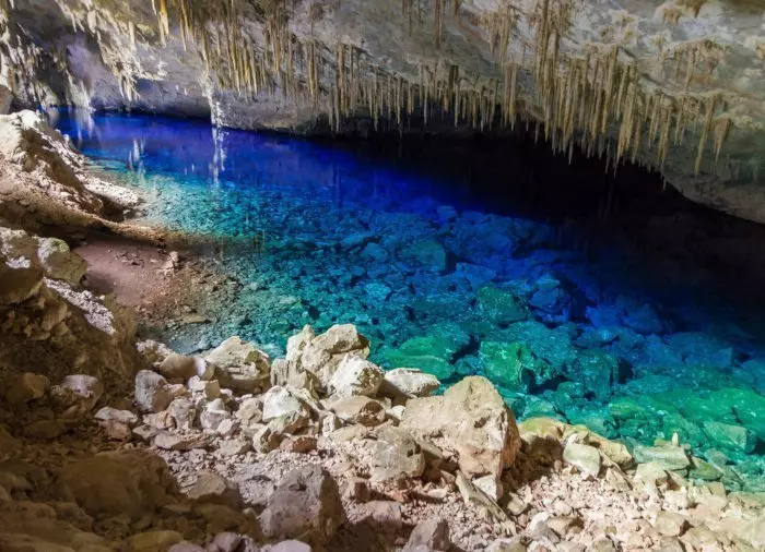 Upplev de natursköna grottorna Gruta do Lago Azul, som är kända för sitt klara turkosblå vatten och sina stalaktitformationer.