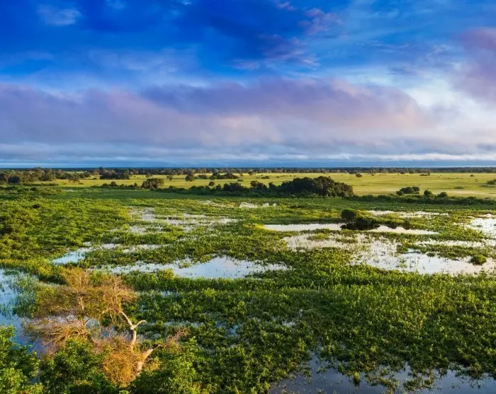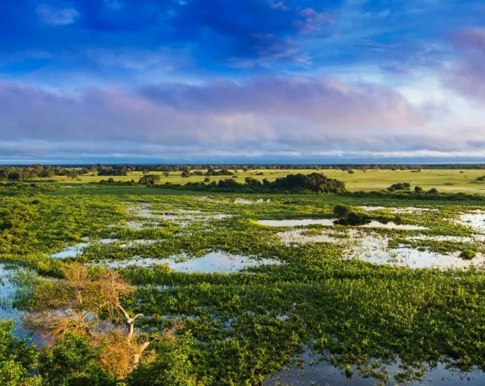 Pantanal betyder sumpmark på portugisiska, och med över 200 000 km² är Pantanal det största våtmarksområdet i världen. Här kan du komma nära inpå bland annat bältdjur, kajmaner, tapirer, myrslokar och kapybaror, som är världens största gnagare. Kattdjur som pumor, ozeloter och jaguarer lever också här, men man behöver lite extra tur för att se dem.