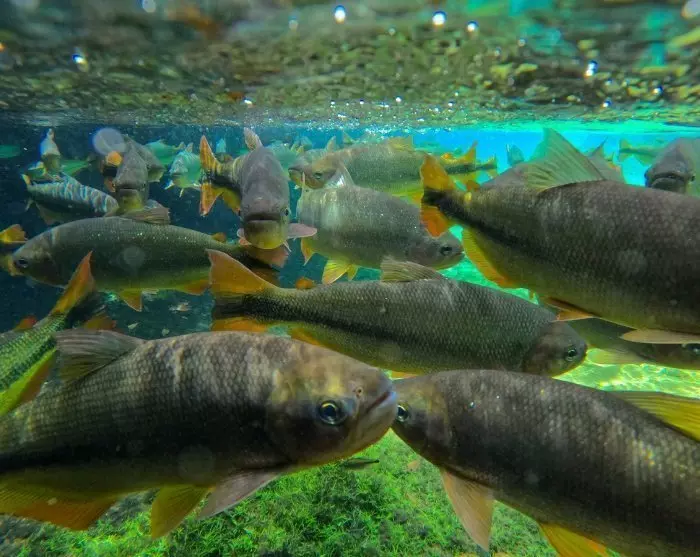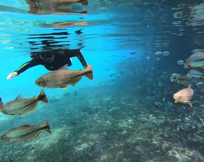 I Bonito väntar en snorkeltur i kristallklara floder bland färgglada fiskar och vattenväxter samt ett besök i det stora zinkhålet, Buraca das Araras, där de mörkröda papegojorna (Ara chloropterus) lever och bygger bon i bergssprickorna.