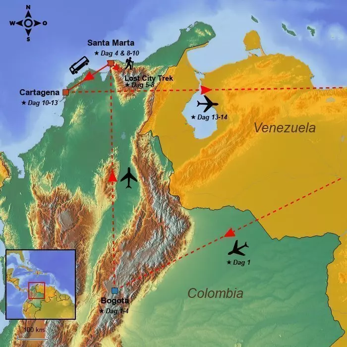 Idag börjar vandringen till Lost City, och nu är det dags att plocka fram din inre Indiana Jones, för denna tur är en mindre expedition till fots genom Sierra Nevadas frodiga djungel. Vandringen är cirka 50 km lång och varar i 4 dagar, med höga temperaturer och hög luftfuktighet. Du övernattar i enkla läger längs vägen. Din skickliga guide leder dig och din grupp till det imponerande ruinkomplexet Ciudad Perdida, även känt som Lost City. Vi garanterar att det blir en utmanande vandring, men vi garanterar också att det är mödan värt, och det kanske blir det bästa minnet du tar med dig hem från din resa i Colombia.