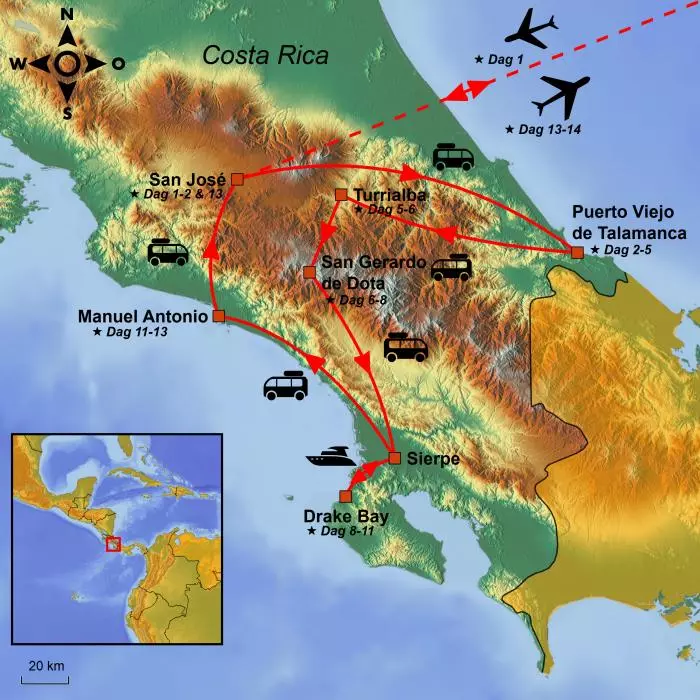 Från San Gerardo de Dotas äventyrliga molnregnskog går resan vidare på snirklande bergsvägar mot Costa Ricas Stillahavskust och staden Sierpe. Här kliver du ombord på en speedbåt, som tar dig den sista biten ut till Drake Bay. Turen går med full fart genom de slingrande kanalerna, omgivna av frodig regnskog, innan du kommer fram till Stilla havet och seglar längs kusten den sista sträckan till Drake Bay.