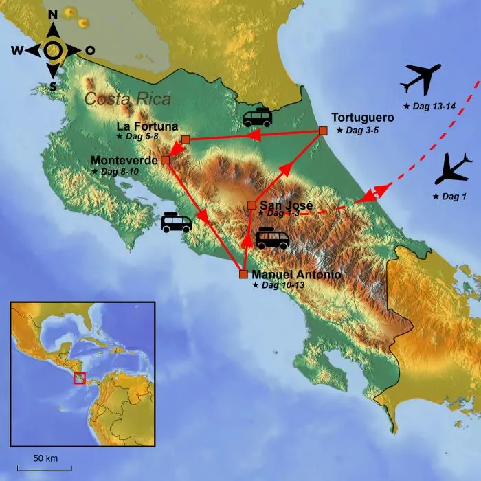 Resan startar i Costa Ricas huvudstad San José och går sedan vidare till den frodiga djungeln i Tortuguero nationalpark. Här omges du av vacker natur och ett spännande djurliv, och all transport sker i båt på Tortugueros många kanaler.