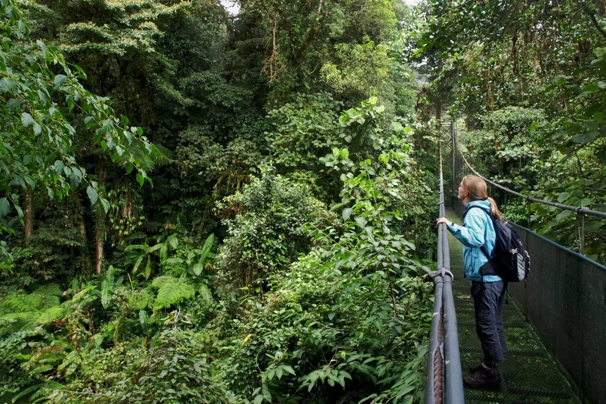 I dag ska du uppleva molnregnskogen från ovan. En erfaren guide tar med dig på en cirka 2,5 kilometer lång vandringstur på hängbroar bland trädtopparna. Här uppifrån kan du på nära håll studera skogens enorma träd, som täcks av mossa, ormbunkar, orkidéer och en massa andra växtarter. Molnregnskogen är dessutom ett paradis för fågelintresserade, då det finns mer än 400 olika arter, bland annat den sällsynta quetzalen och en mängd olika kolibrier. Guiden kan berätta om områdets många olika växt-, djur- och insektsarter.