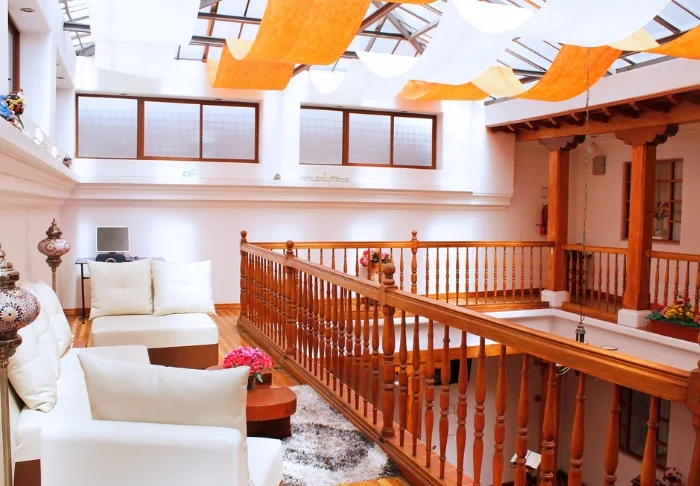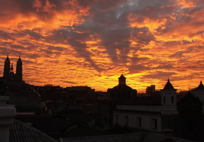 Efter en spännande dag i Quito kan du koppla av i hotellets lilla loungeområde eller på utomhusterrassen där du kan se solen gå ner bakom bergen.