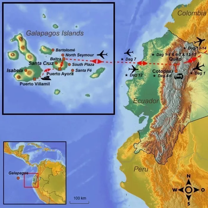 Resan avslutas med sex dagars öhoppning på de unika Galápagosöarna, där du besöker tre olika öar. Se fram emot att uppleva den mysiga stämningen på öarna och självklart den imponerande naturen och det fascinerande djurlivet. Här kan du bland annat möta den enorma galápagossköldpaddan, sjölejon, havs- och landleguaner, revhajar, havssköldpaddor, flamingor och blåfotade sulor för att bara nämna några få.