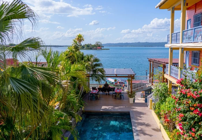 Detta färgglada hotell ligger med vacker utsikt över sjön Petén Itzá och i närheten av stadens katedral.