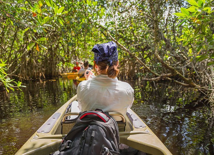 Ungefär klockan 13 är det dags att ta en timmes paus och njuta av en utsökt lunch på en lokal restaurang i Lembongan. När hungern är stillad ska du uppleva den fantastiska mangroveskogen, som täcker det mesta av den nordöstra delen av Lembongan. Du kan välja om du vill njuta av en lugn och fridfull tur i en kajak eller i en liten båt. Mangroveträden är viktiga för ekosystemet i området, då de tar upp femtio gånger mer koldioxid än vanliga träd och bidrar till att ge liv åt de många korallreven.