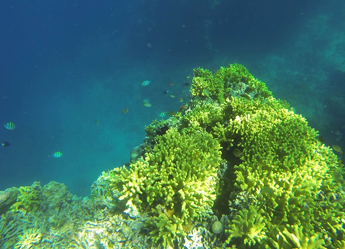 Revet och det marina livet här vid Menjangan är känt för att vara av absolut världsklass av både dykare och snorklare så det är bara att hoppa i. Din guide visar runt i vattnet och pekar ut och berättar om de fina, färgrika fiskarna och korallerna.