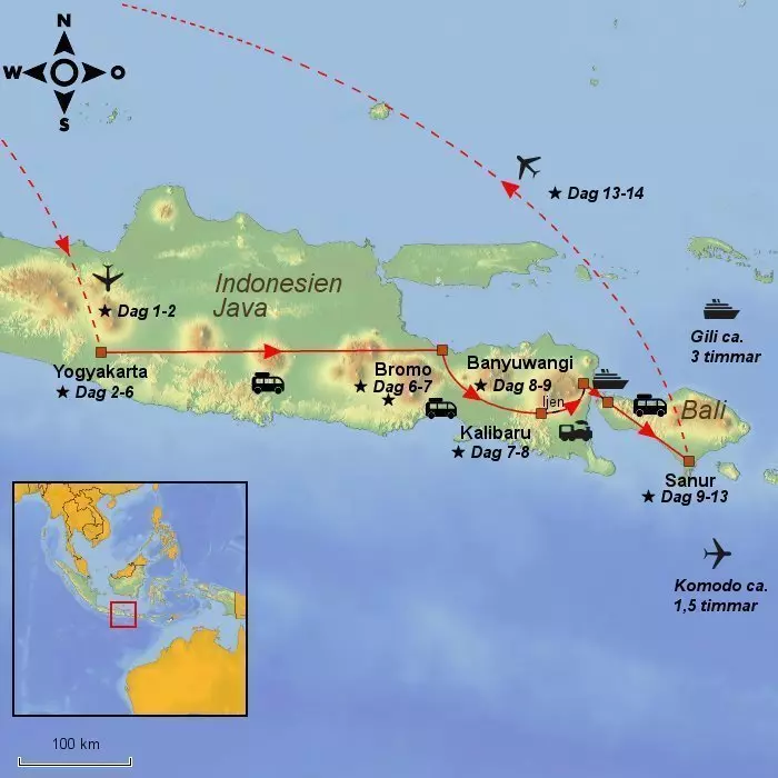 Java ligger på den indonesiska delen av ”Eldringen” som består av världens mest aktiva vulkaner. Överallt på Java befinner du dig i ett mycket fascinerande landskap med vackra, gröna risfält med imponerande, ikoniska vulkaner i bakgrunden. Du får uppleva byar och städer som är flera hundra år gamla – vissa har gator och gränder som utgörs av broar, andra skuggas av tjugo meter höga, decimetertjocka bambustjälkar. Mitt bland allt detta ligger det imponerande Borobudur, som är en av världens allra största och vackraste buddhistiska helgedomar. Inte långt därifrån ligger också det mycket vackra hinduistiska tempelkomplexet Prambanan. Du besöker den aktiva vulkanen Bromo och vandrar dit genom det legendariska ”sandhavet”. På resan genom Java får du också uppleva krydd-, kaffe- och teplantager, kontrasterna mellan en traditionell och modern livsstil samt en leende och gästvänlig befolkning. Pricken över i:et blir några avkopplande dagar på Balis vackra stränder i Sanur.