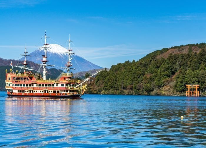 Nere vid Togendai Station, går du ombord på en båt och åker över den pittoreska sjön Ashi. Ett vulkanutbrott för 3 000 år sedan skapade den krater, som i dag utgör denna vackra kratersjö. Från båten njuter du av den vackra utsikten över vattnet och de omkringliggande bergen som ramar in sjön.