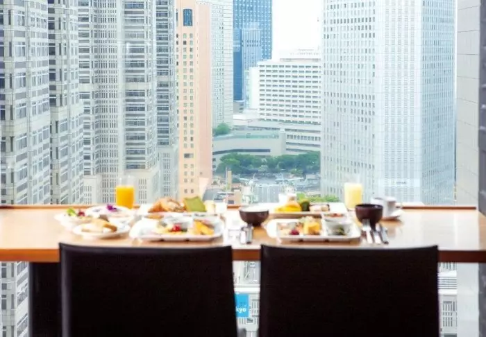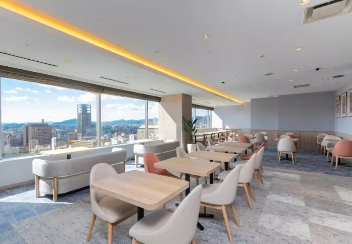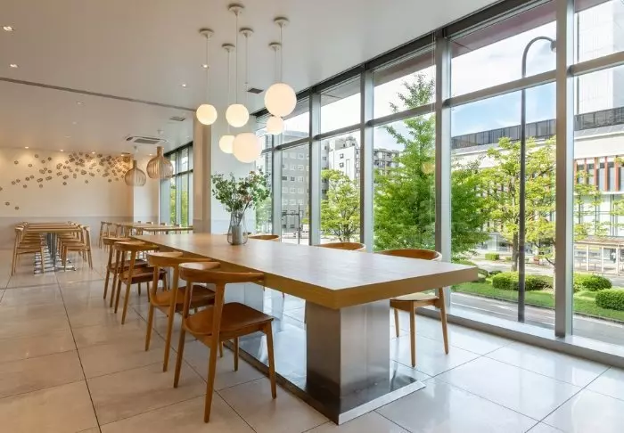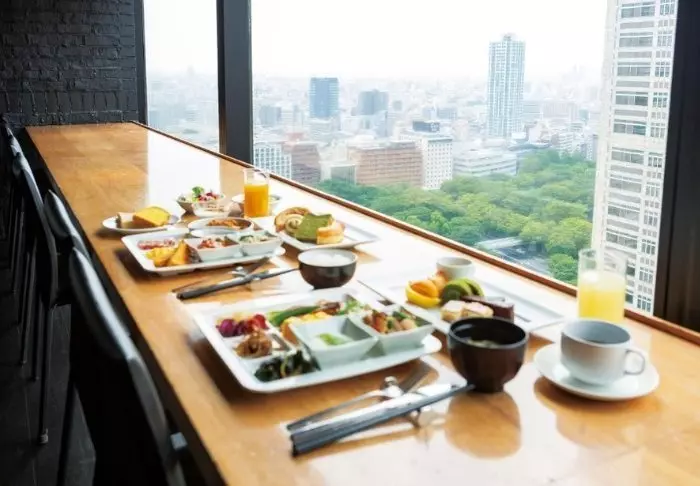 I hotellets restaurang, VistaCafé, serveras japansk och västerländsk frukost varje morgon. Här kan du sitta och se ut genom de stora fönsterpartierna och njuta av trädens fina färger beroende på årstiden.