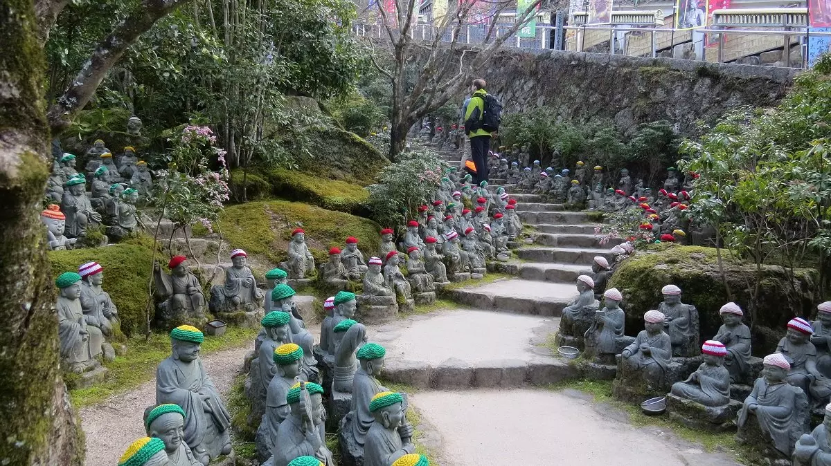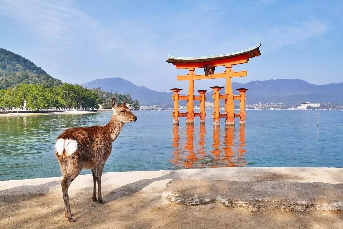 Vi föreslår en dagstur till Miyajima. Miyajima ligger mindre än en timmes resväg från Hiroshima, och det är lätt att ta sig dit med kollektivtrafiken. Här hittar du den knappt tjugo meter höga världsberömda orangeröda porten som ligger ute i vattnet och som vid högvatten ser ut som om den flyter på vattnet. När du anländer med färjan till ön, som egentligen heter Itsukushima, passerar du genom flera turistgator med souvenirbutiker, delikatessbutiker och caféer innan du kommer fram till platsen där du kan se den enorma porten. På vägen kommer du säkert att stöta på de tama sikahjortarna. På ön ligger Daisho-in, ett buddhistiskt tempel som är öppet för besökare. En lustig detalj här är att buddhafigurerna ofta har halsduk och mössa på sig. Du kan också ta linbanan till toppen av berget Misen där du har en slående utsikt över Hiroshima och inlandshavet med över 3 000 små öar. Det finns också fina vandringsvägar på ön.