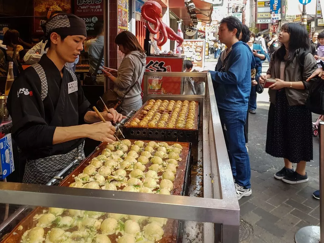 På eftermiddagen bör du ta en promenad genom det livliga och färgglada nöjesområdet Dotonbori, som är en av Osakas mest besökta platser. Här kan du fördriva flera timmar genom titta på de många reklam- och neonskyltarna, studera människomyllret och strosa runt i labyrinten av butiker och de berömda matstånden. Om du är sugen på att prova något lokalt kan vi rekommendera kushi katsu, vilket är stekta grönsaker och kött på spett, eller takoyaki – bläckfiskbollar som liknar munkar, men är något helt annat. De är salta och innehåller bläckfisk samt purjolök eller salladslök.