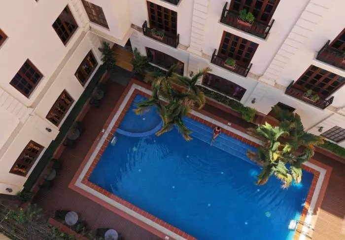 Steung Siemreap har dessutom ett härligt poolområde med palmer och tropiska träd samt tillgång till både solstolar och parasoller.