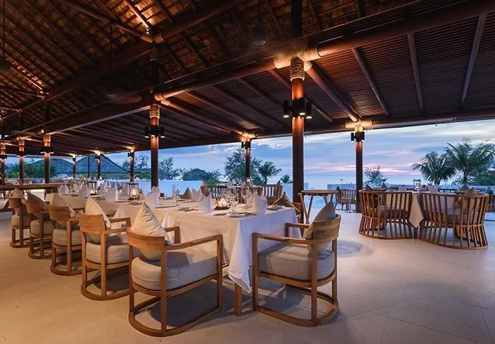 Den mysiga restaurangen ligger på en övertäckt terrass med utsikt över havet och poolen. Här trollas det fram läckra rätter från det kambodjanska och internationella köket till frukost, lunch och middag. Det finns även en välsorterad vinmeny.