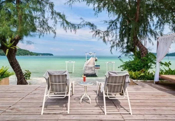Veranda Natural Resort ligger på en frodig kulle nedanför Kep nationalpark och med utsikt över Thailandbukten, Tonsay och Phnom Bokor nationalpark i horisonten. Resorten ligger på ett 2,5 hektar stort och naturskönt område så det finns gott om plats för vilda lekar, men också för att ha det lugnt och skönt. Resorten är inredd med öga för skönhet, lugn och god mat. Från resortens huvudbyggnad leder gångbroar av trä genom det gröna området till rummen. De rymliga rummen (30 kvadratmeter) är individuellt inredda i minimalistisk stil med lyxiga material, aircondition, gratis wifi, kaffe- och tefaciliteter, minibar, tv, värdeskåp, morgonrockar, hårtork, eget badrum och en veranda.