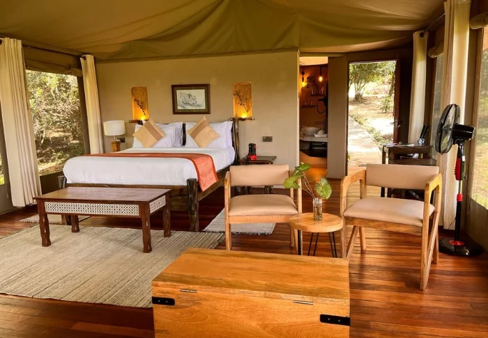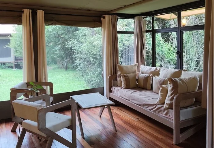 Hela dagen har du varit på game drive i Masai Mara, men nu ligger du bara och kopplar av och njuter av ljuden från bushen. Ditt tält är inrett som ett klassiskt safaritält, men med lyxiga tillbehör. Här finns det kanvasväggar och mjuka sängar med myggnät runt , och eget badrum med varmt vatten. Kanske blundar du en stund i stolen. På natten kan man tydligt höra alla djurläten genom kanvasväggen, så du vaknar ett par gånger under natten. Men vem vill inte vakna till lejonvrål i fjärran?