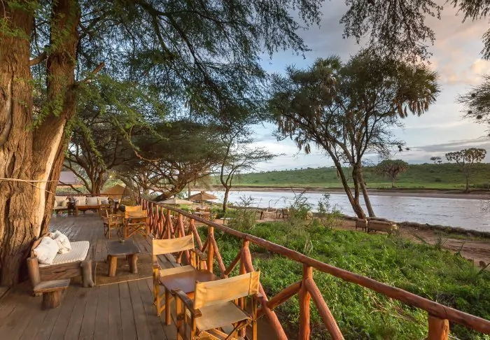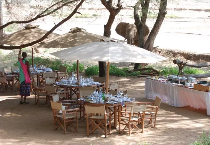 Lägrets stora dragplåster är ”loungen”. Sätt dig i en mjuk stol, beställ en kall öl och njut av utsikten över floden framför dig. Det blir svårt att resa sig upp härifrån igen! Som tur är behöver du inte gå särskilt långt för att komma till restaurangen – den ligger i ett granntält i anslutning till loungen. Maten är fantastisk och om du har tur kan du få sällskap av en elefant som vandrar in i lägret under lunchen.