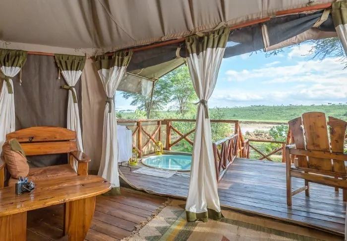 De 12 tälten är inredda efter konstens alla regler med mjuka sängar, trägolv, härliga täcken i vackra färger och det finns gott om plats till både säng, bord och fåtöljer. Alla tält har naturligtvis ett eget badrum med rinnande (varmt och kallt) vatten. Alla tält har en egen terrass med en liten pool, där du kan svalka dig under de varma dagarna.