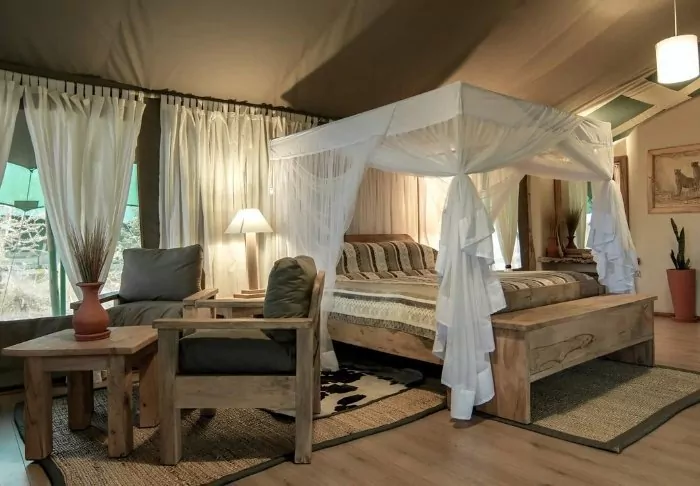 De stora tälten erbjuder gott om plats för ditt bagage och är mycket trivsamt inredda. Alla tält har egen veranda och fasta golv både ute och inne, vilket ger känslan av att bo på ett rum – med kanvasväggar. Det finns wifi i alla tält.