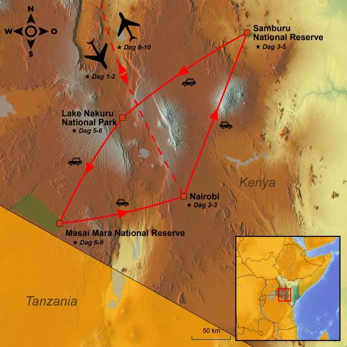 Du korsar ekvatorn och har möjlighet att komma nära inpå det fantastiska och varierande djurlivet i viltreservaten Samburu och Masai Mara. Det första har sina ”special five” och fantastiska landskap, och det andra de karakteristiska akacieträden som ger skugga till savannens djur. Du upplever de fantastiska landskapen vid den 5 000 km långa Great Rift Valley med vattenfall, vulkankratrar och nationalparken Lake Nakuru, som är känd för sina många noshörningar. Det finns även möjlighet att besöka de långa, rödklädda massajerna i deras byar.