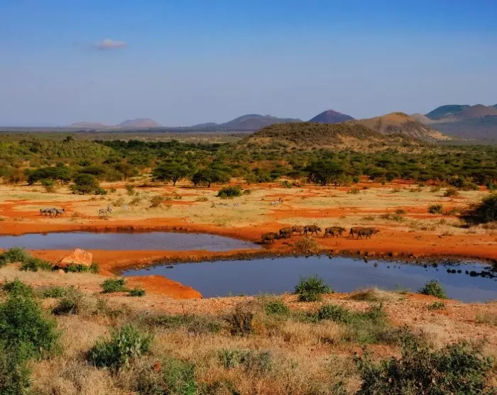 Medan Tsavo East kännetecknas av sin ljusröda jord, är Tsavo West konturer i landskapet, tätare vegetation och lavafält. De täta buskarna i Tsavo West gör det ofta svårare att upptäcka djuren, men den unika naturen mer än kompenserar för detta – tillsammans med den vackra utsikten över Kilimanjaro.