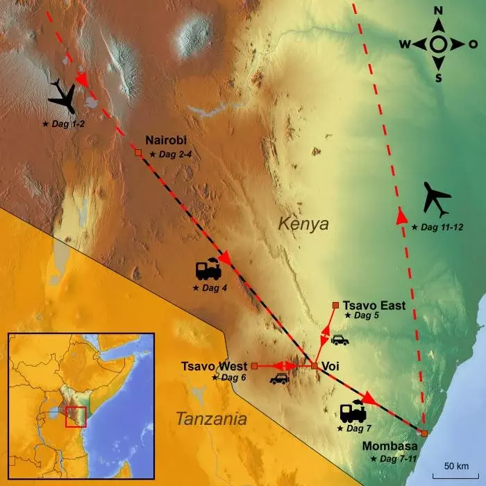 Följ med på en legendarisk tågresa från Kenyas pulserande huvudstad Nairobi till de röda elefanterna i landets största nationalpark, Tsavo. Efter några dagars safari fortsätter tågresan mot den vackra Kenyakusten.