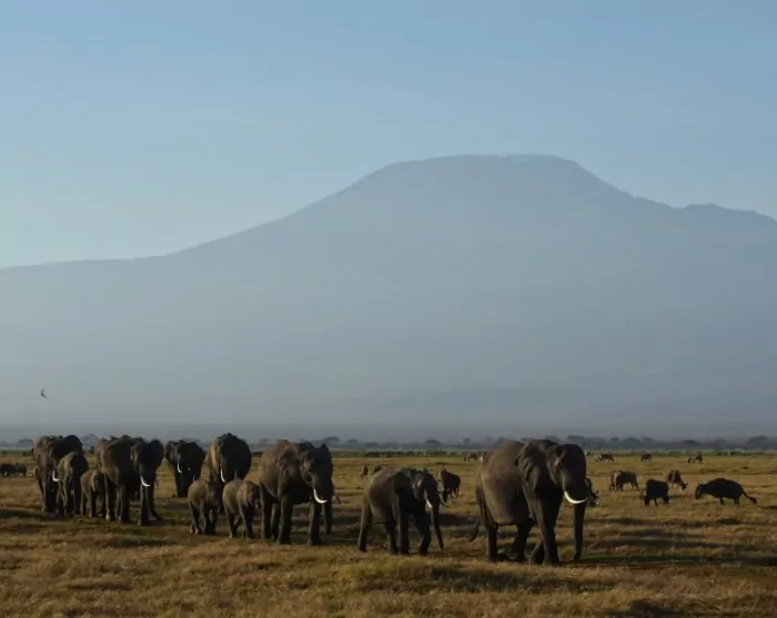 Nästan vart du än går har du utsikt över Kilimanjaro, som ligger i Tanzania, men som förmodligen fotograferas oftare från Kenya-sidan. Det är här i Amboseli som du kan ha turen att få det perfekta fotot på elefanter som går över det pannkaksliknande landskapet när solen går ner innan de ger sig in i skogarna vid foten av Kilimanjaro, där de tillbringar natten. Elefanthjordarna är stora, och många av elefanterna har gigantiska betar.