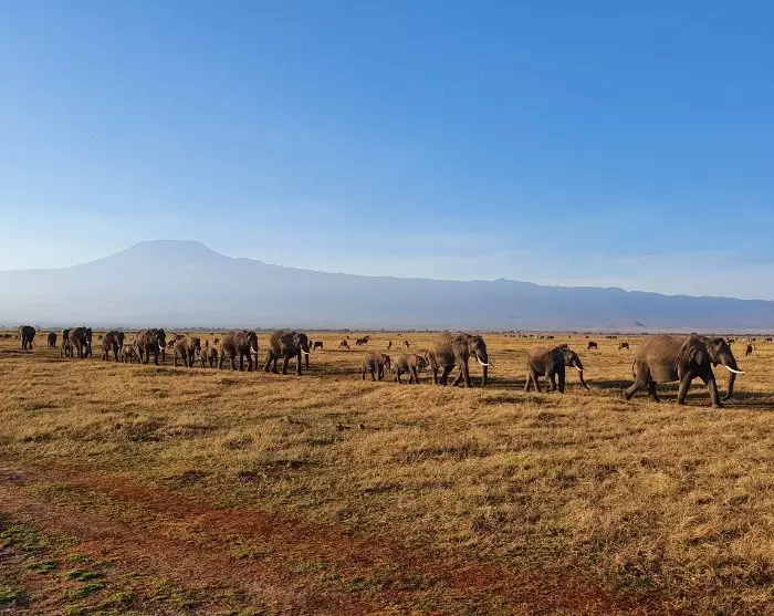 Resan fortsätter till den fantastiska nationalparken Amboseli. Amboseli kan vara en av Kenyas minsta nationalparker, men åsynen av elefanterna – lätt dammiga på grund av det torra landskapet – med Kilimanjaro i bakgrunden är fantastisk.