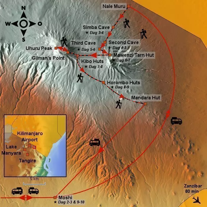 Höjder: Moshi: 915 m.ö.h., Rongai Gate: 2 150 m.ö.h., Simba Camp: 2 750 m.ö.h.