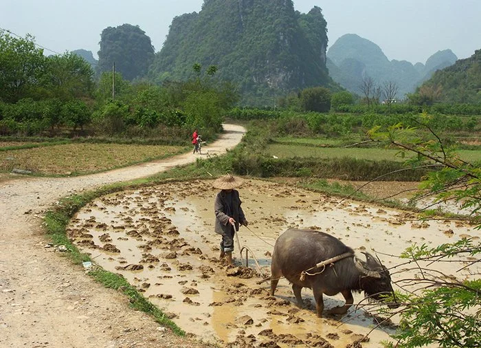 Du cyklar längs Yulong-floden, som är en biflod till den stora Li-floden och går från Guilin till Yangshuo. Turen går förbi rismarker, grönsaksodlingar och genom små, charmiga bysamhällen, vilket ger en inblick i böndernas vardag. Längs vägarna står ibland lokala kvinnor som säljer vackra, handgjorda blomsterkransar medan männen arbetar ute i markerna. Kanske har du turen att få se dem plöja med hjälp av en vattenbuffel.