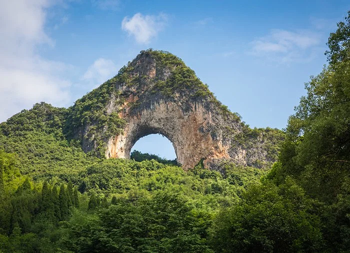 Vid lunchtid kommer du till en av Yangshuos höjdpunkter: den speciella klippan Moon Hill, som är uppkallad efter ett månformat hål på toppen.