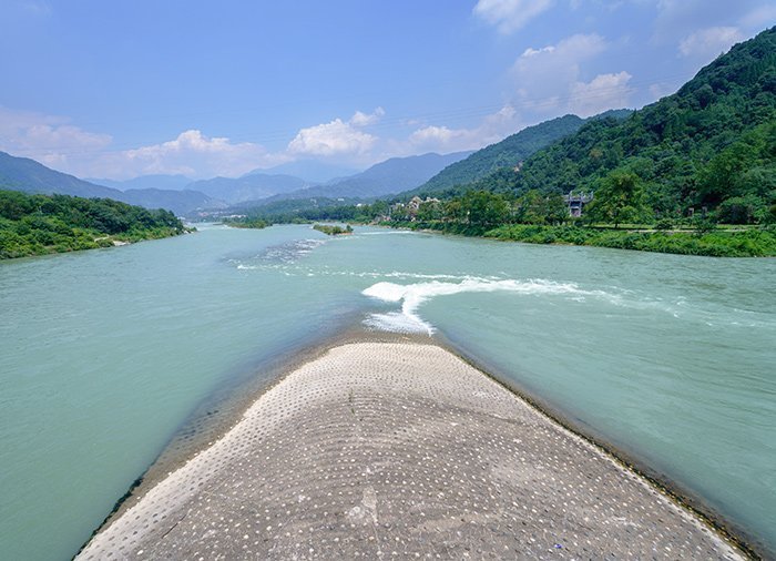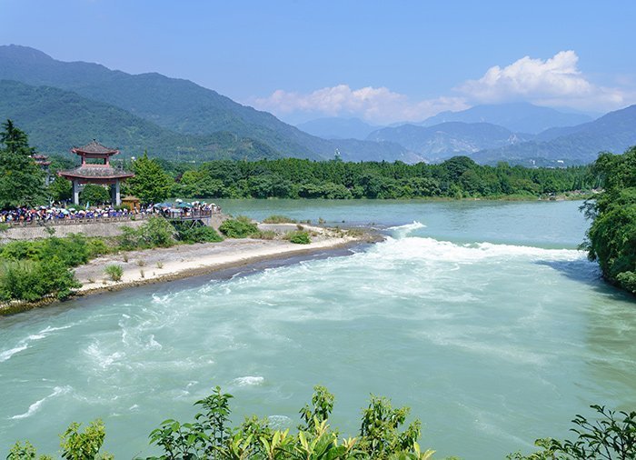 Dujiangyan konstbevattningssystem vid Minjiang-floden är världens enda konstvattensystemet utan fördämning, och det ligger otroligt vackert bland berg och tempel. Dujiangyan byggdes år 256 f.Kr. för att förhindra översvämning av Chengdu-slätten. I dag, över 2 000 år senare, fungerar vattensystemet fortfarande.