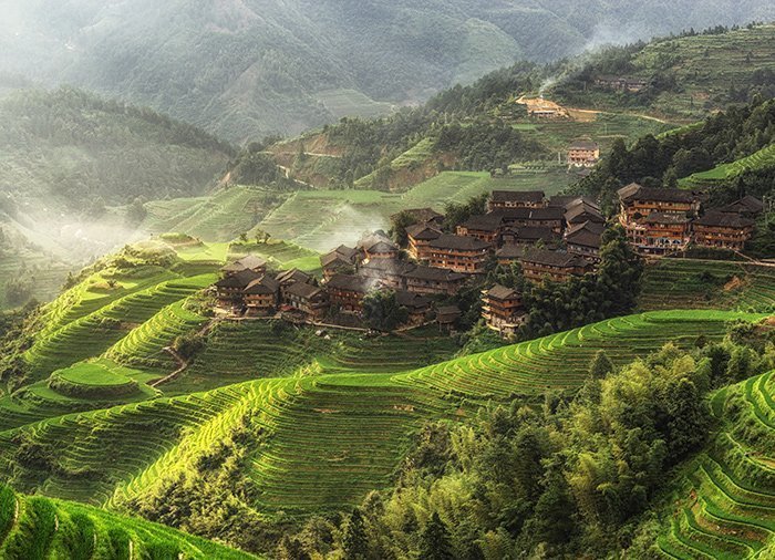 Ping’an är berömt för sitt läge mitt bland Longjis vackra risterrasser som sträcker sig så långt ögat når. Longji betyder drakrygg och det är precis vad de svängda risterrasserna ser ut som. Det är inte svårt att förstå varför det sägs att de är världens vackraste och varför de lockar poeter, fotografer och turister från när och fjärran. De är både enorma, vackra och överväldigande! Det var Zhuang-stammens förfäder som i tidernas begynnelse anlade risterrasserna som klänger sig fast vid de branta bergssluttningarna på 300–1 100 meters höjd.
