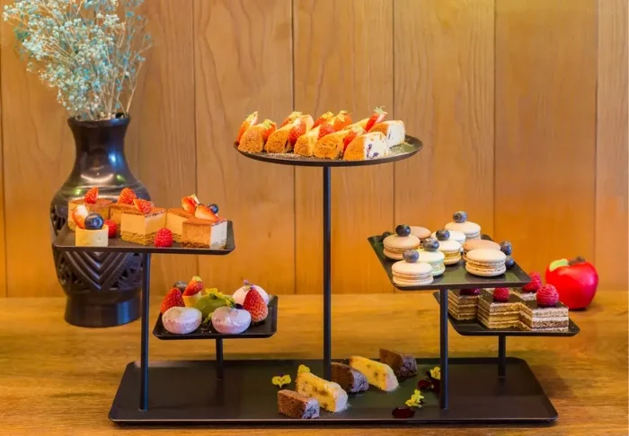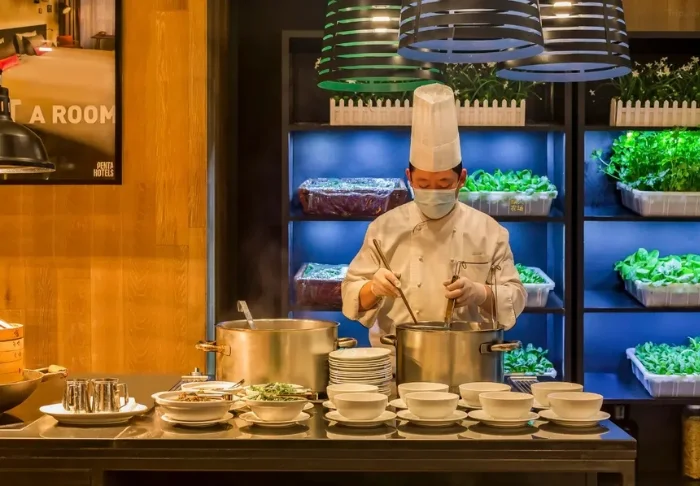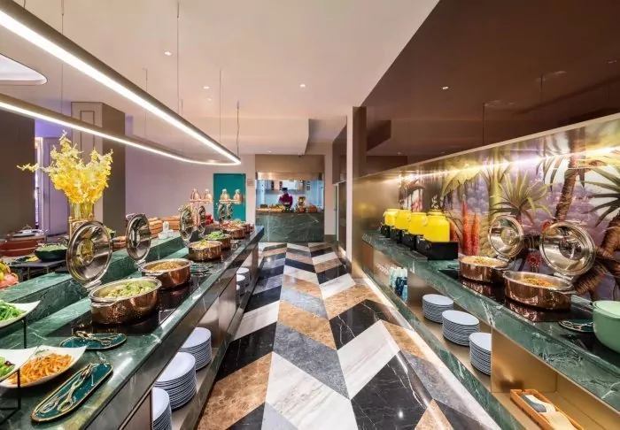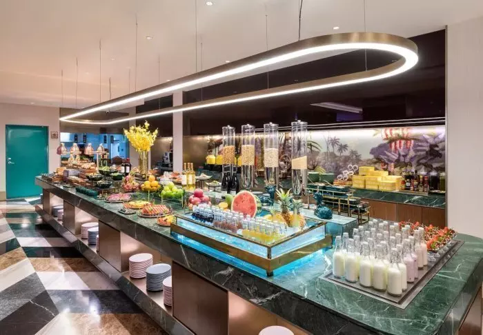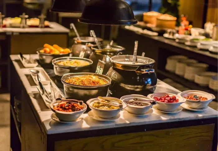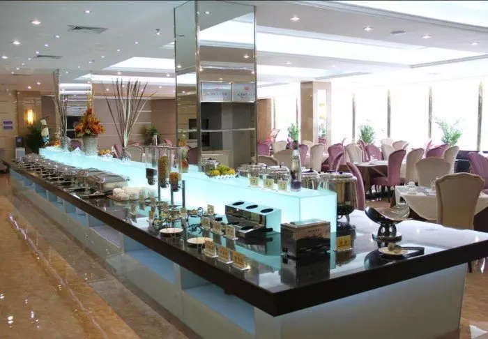 I hotellets frukostrestaurang väntar dig varje dag ett stort och läckert urval av både västerländsk och kinesisk mat i den stora frukostbuffén.