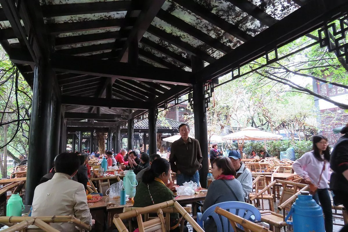 Det finns inget bättre sätt att komma nära inpå lokalbefolkningen än att sätta sig på ett av de mysiga tehusen i Chengdu, till exempel i Folkets Park. Folkets Park grundades 1911 och var den första offentliga parken i Chengdu. I dag är den en av de bästa folkparkerna i Kina. Slå dig ner vid ett bord i tehuset Heming vid parkens sjö, beställ en kopp te och bara njut av atmosfären. Här går samtalen varma, mahjongbrickorna flyttas snabbt runt på borden och man dricker husets bästa te med många påfyllningar. Vissa får öronen rengjorda av professionella behandlare som använder pannlampor, pincetter, tänger och borstar med gåsfjädrar. Ja, välkommen till Chengdu!