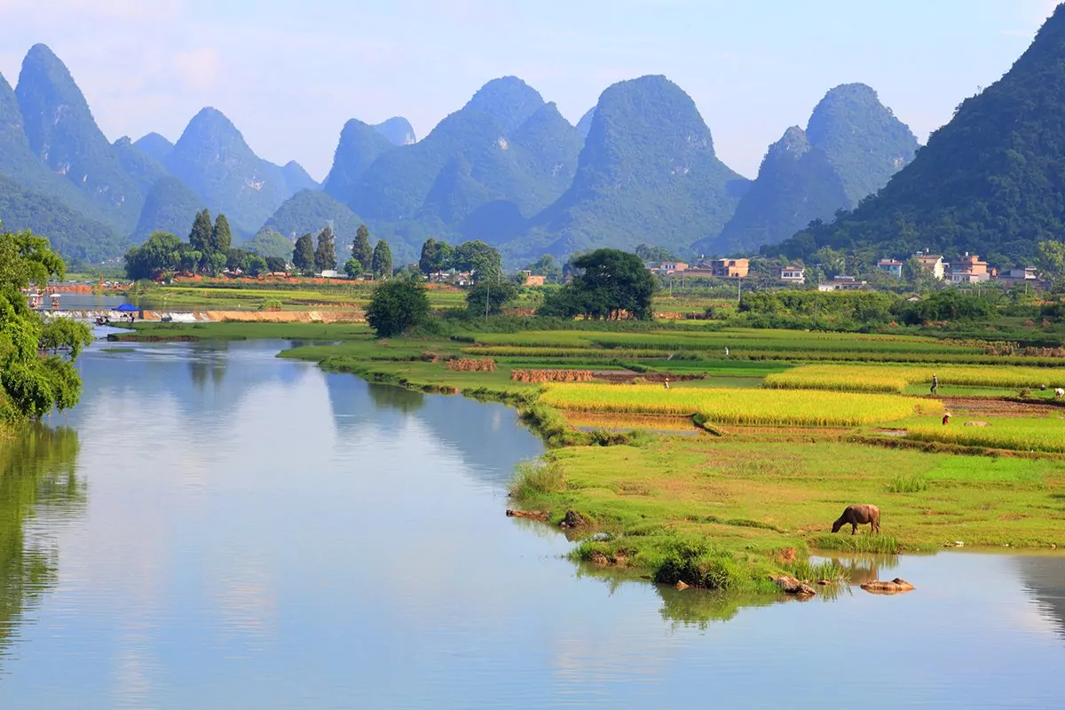 Ju längre sydväst du kommer, desto friskare blir luften. Det märks särskilt tydligt i Yangshuo, där du förtrollas av de poetiska och intagande landskapen. Här står höga, asymmetriska kalkstensberg, som avspeglas i de lugna floderna Li och Yalong. Landskapet är så vackert att det har förevigats på Kinas 20 yuan-sedel.
