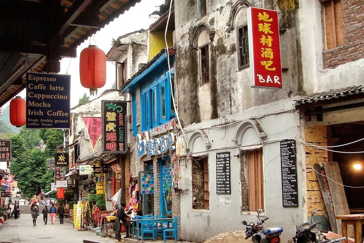 Mitt i stadens centrum sjuder det av liv. Här ligger barer och restauranger på rad, och särskilt gatan West Street är en populär mötesplats. West Street är den äldsta gatan i Yangshuo, med en historia som sträcker sig över 1 400 år tillbaka. Det återspeglas också i de gamla, charmiga husen. Det är dessutom här öst möter väst: Gatan är fylld med butiker, caféer och matställen där du kan prova både västerländska och kinesiska specialiteter.
