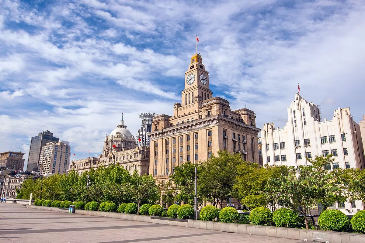 Du får promenera längs The Bunds 1,5 km långa hamnpromenad som löper längs Huangpu-floden. Här får du en känsla av att befinna dig i två världar. På den ena sidan av floden ligger de vackra grå engelska stenbyggnaderna med praktfulla pelare, och på den andra sidan ser du Shanghais berömda skyline med moderna skyskrapor, som lyses upp när mörkret faller. På 1930-talet var The Bund Shanghais motsvarighet till Wall Street. Här fanns både det tidigare engelska konsulatet, Bank of China, huvudkvarteret för North China Daily (dåtidens engelskspråkiga tidning), det gamla tullhuset som byggdes som en kopia av Big Ben samt Hong Kong & Shanghai Bank, som 1923 var världens nästa största bank. I dag huserar byggnaderna exklusiva modebutiker, hotell, nattklubbar och restauranger.