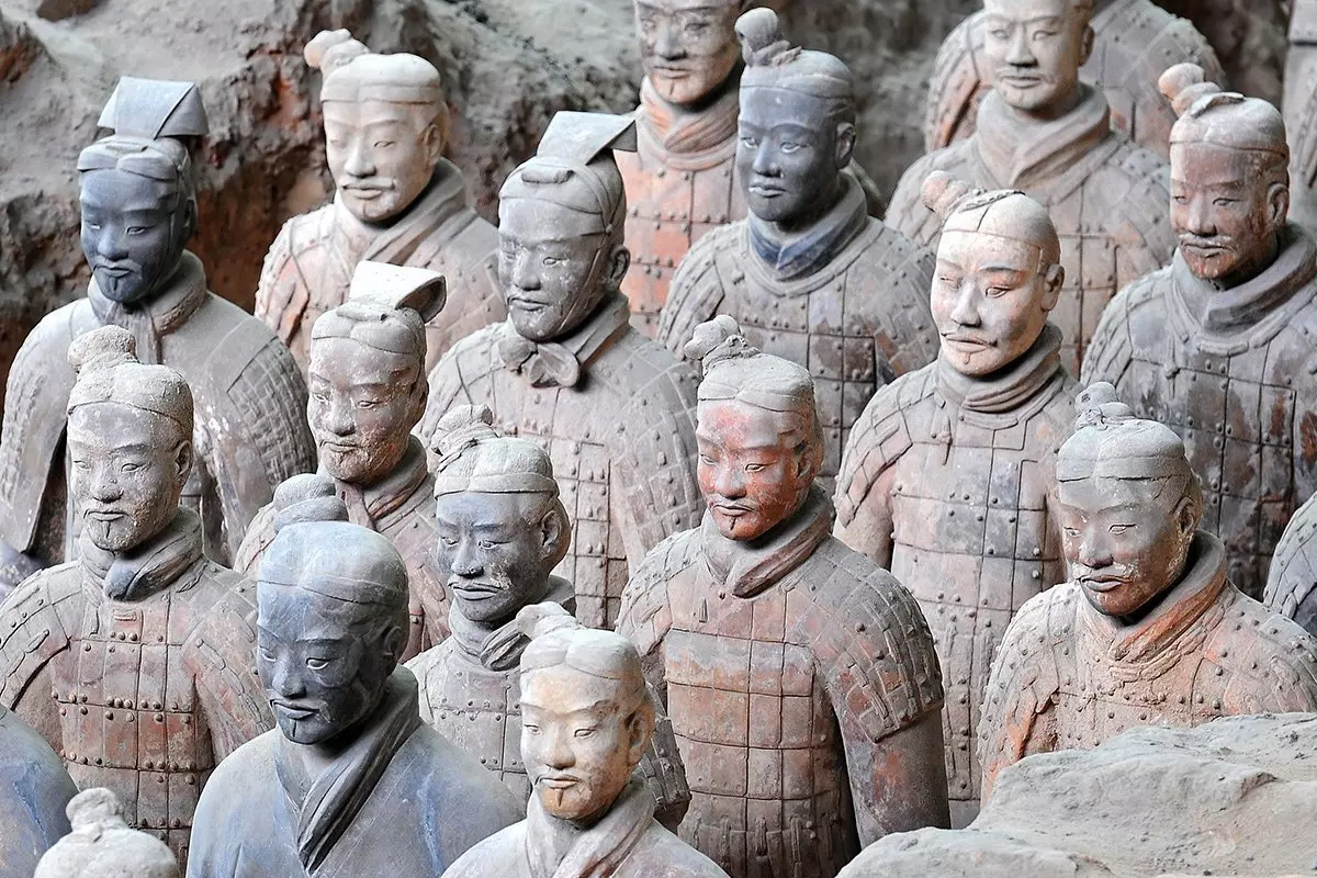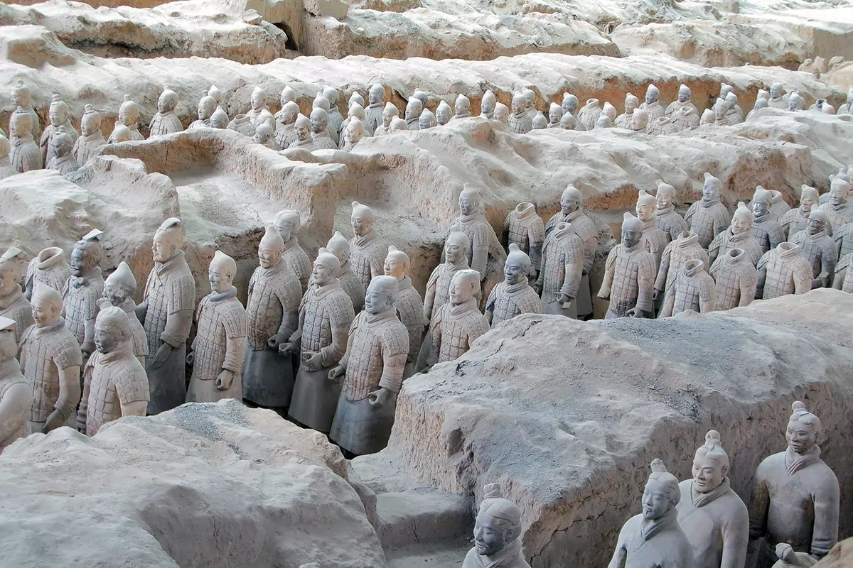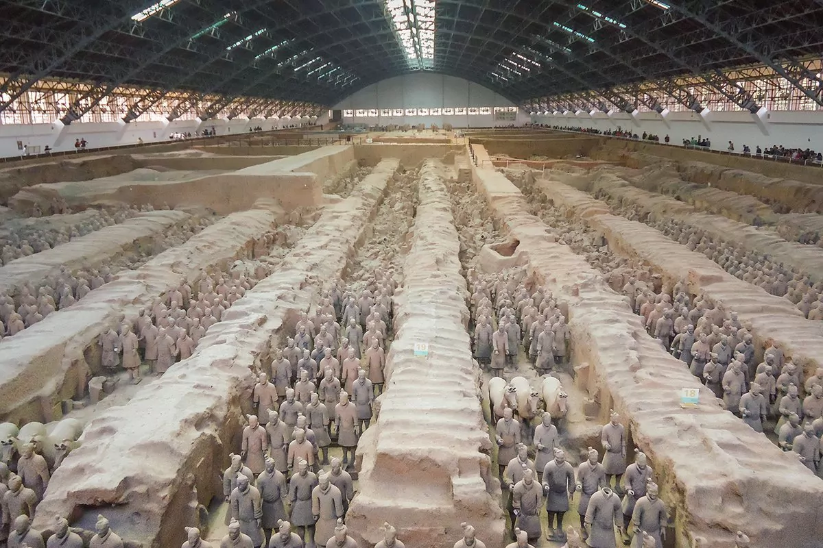 Det var lokala bönder som höll på med sitt dagliga arbete ute på fälten, som 1974 hittade fragment av en skulptur i människostorlek. Arkeologer kallades dit för att fortsätta utgrävningarna, som resulterade i världens största fynd av underjordiska skulpturer. De upptäckte över 7 000 terrakottasoldater, -hästar och -vagnar. Soldaterna är mellan 175 och 190 cm höga, och ingen soldat är den andra lik. De har alla olika dräkter, frisyrer och ansiktsdrag. De är uppställda på rad redo för strid nära kejsaren Qin Shi Huangs gravmonument. Det sägs att soldaterna byggdes för att beskydda sin härskare i livet efter döden.