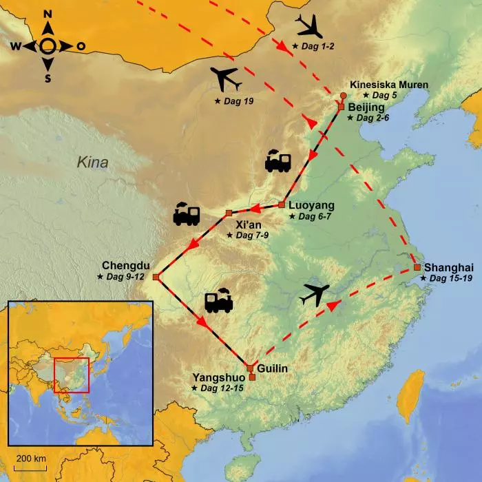 Du startar i den kejserliga huvudstaden Beijing, där du besöker den enorma samlingspunkten Himmelska fridens torg. Bakom de tjocka, röda murarna norrut döljer sig det mäktiga kejsarpalatset i Den förbjudna staden. Norr om palatset ligger det konstgjorda Kolberget, där du i klart väder har en härlig utsikt över palatset och den livliga huvudstaden.