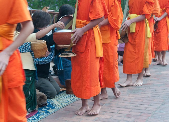 Under de tidiga morgontimmarna, vid templens ringning, får du bevittna en helt unik upplevelse i Luang Prabang. I den friska morgonluften går mer än 300 munkar i en stilla procession varje morgon genom stadens gator för att samla in ris och andra livsmedel, som de mottar i allmosor från lokalbefolkningen, i sina karaktäristiska bronsskålar. Ritualen är en tradition, där munkarna ber om mat för att demonstrera sin ödmjukhet. Denna vandring är en viktig religiös handling i buddhismen och ska utföras respektfullt både av lokalbor och turister. Om du vill delta i ritualen kan guiden visa dig hur du gör det på bästa sätt.