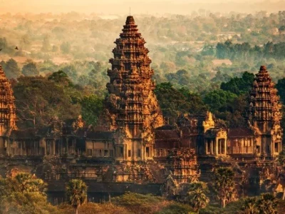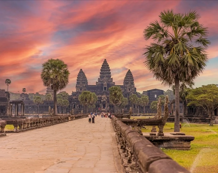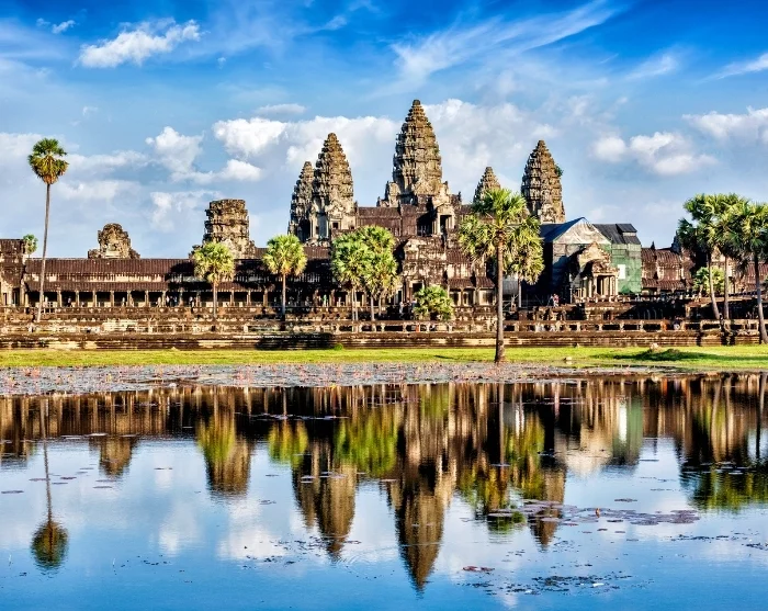 Tempelkomplexet Angkor Wat, som är Kambodjas främsta attraktion. Templet var Khmerrikets mest praktfulla tempel och ett arkitektoniskt mästerverk. Det sägs ha krävt 300 000 man, 6 000 elefanter och 37 år för att bygga komplexet.