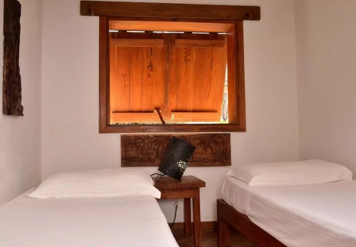 Bungalowerna är byggda av sten med halmtak och bjälkar av rosenträ. Vackra, varma trägolv välkomnar dig, och väggarna är smakfullt dekorerade med lokal konst och hantverk. Tillräckligt mycket – men inte så mycket att det stör utsikten från de stora fönstren. Tack vare lodgens strandläge har alla bungalows utsikt över stranden. Du kan också njuta av detta från din privata terrass, där du hittar ett par solstolar som väntar på att användas.