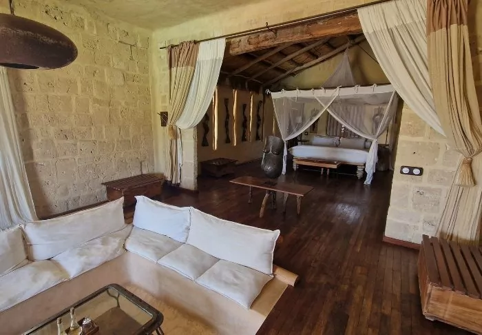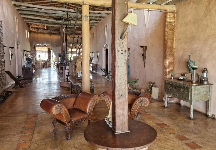 Inne i lodgen kan du tydligt känna influenserna av den afrikanska kontinenten. Bruna färger, trä och sten dominerar, men på ett lyxigt och smakfullt sätt. Allt är vackert dekorerat, och det känns nästan som om du besöker en privat konstsamlare.